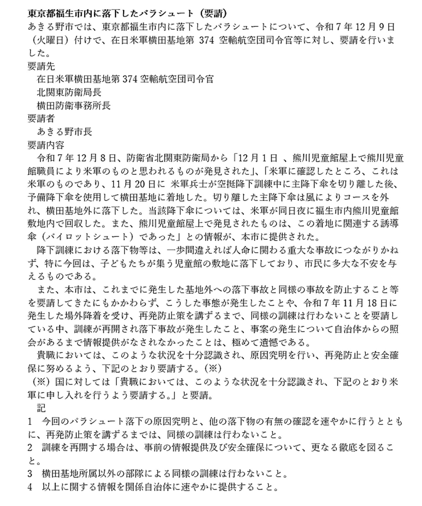 あきる野市長が2度にわたるパラシュート降下訓練事故で要請要請する。